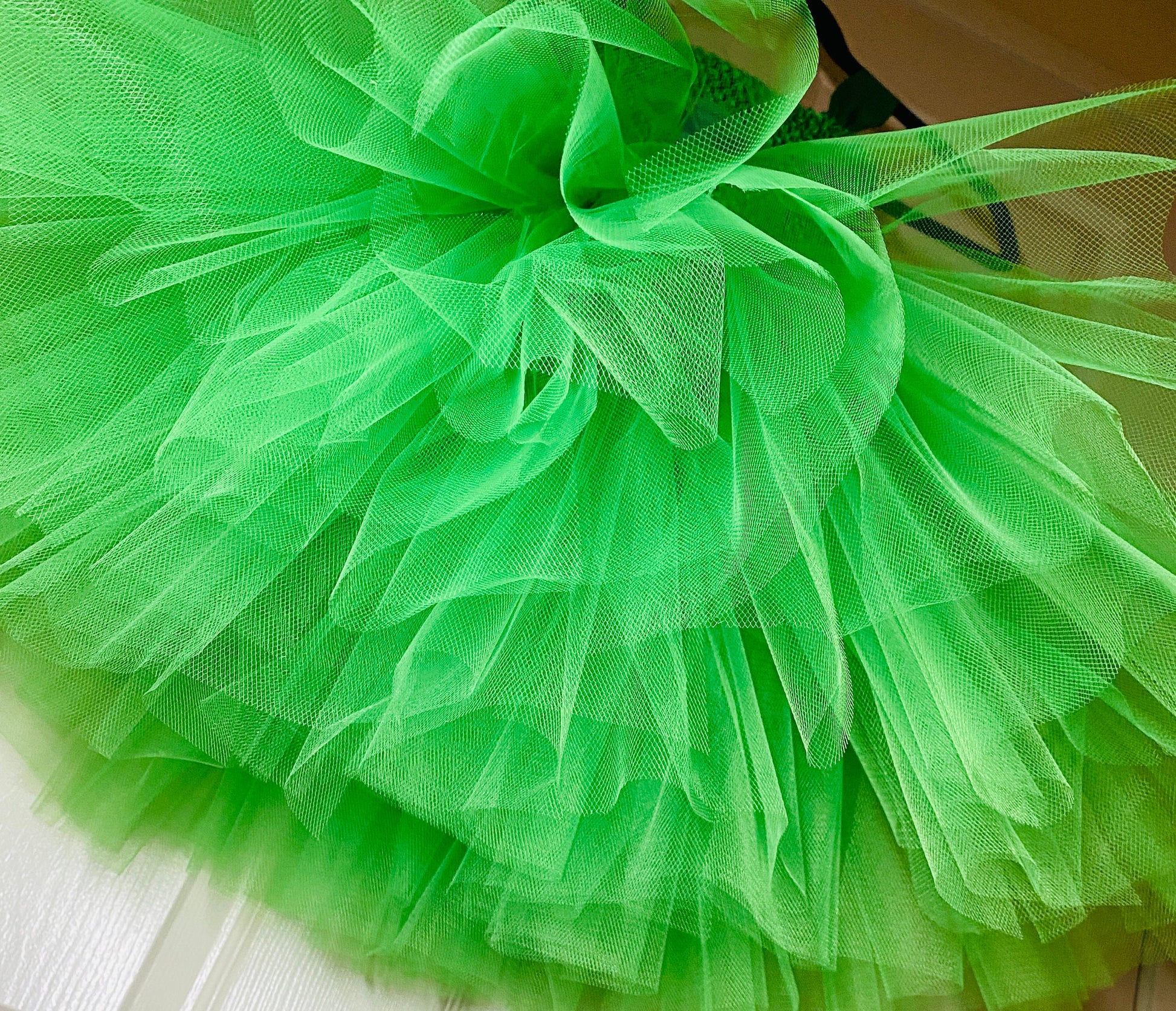 - Green tulle skirt is crocheted into the bottom of the tube top providing a petticoat type puffiness
