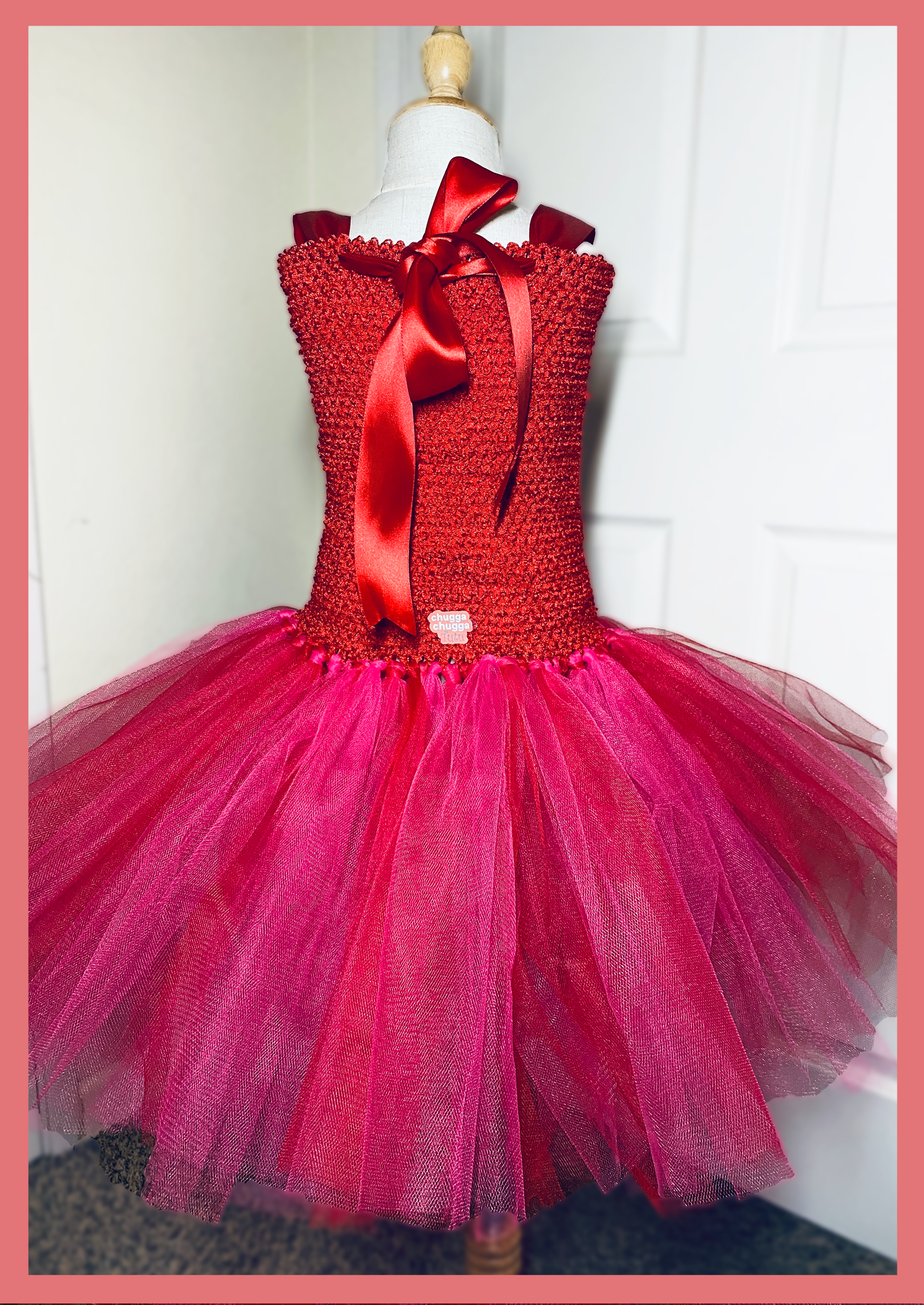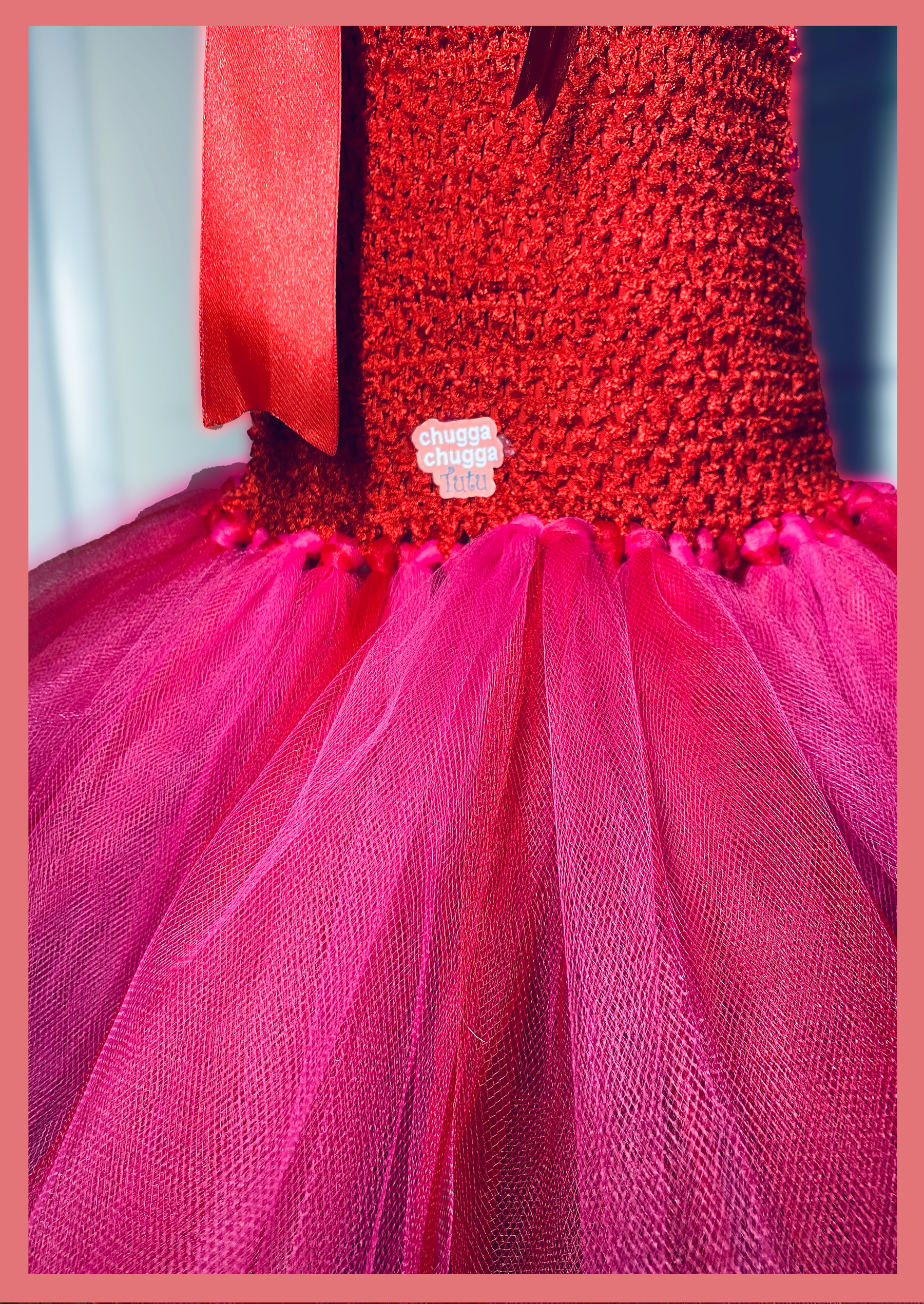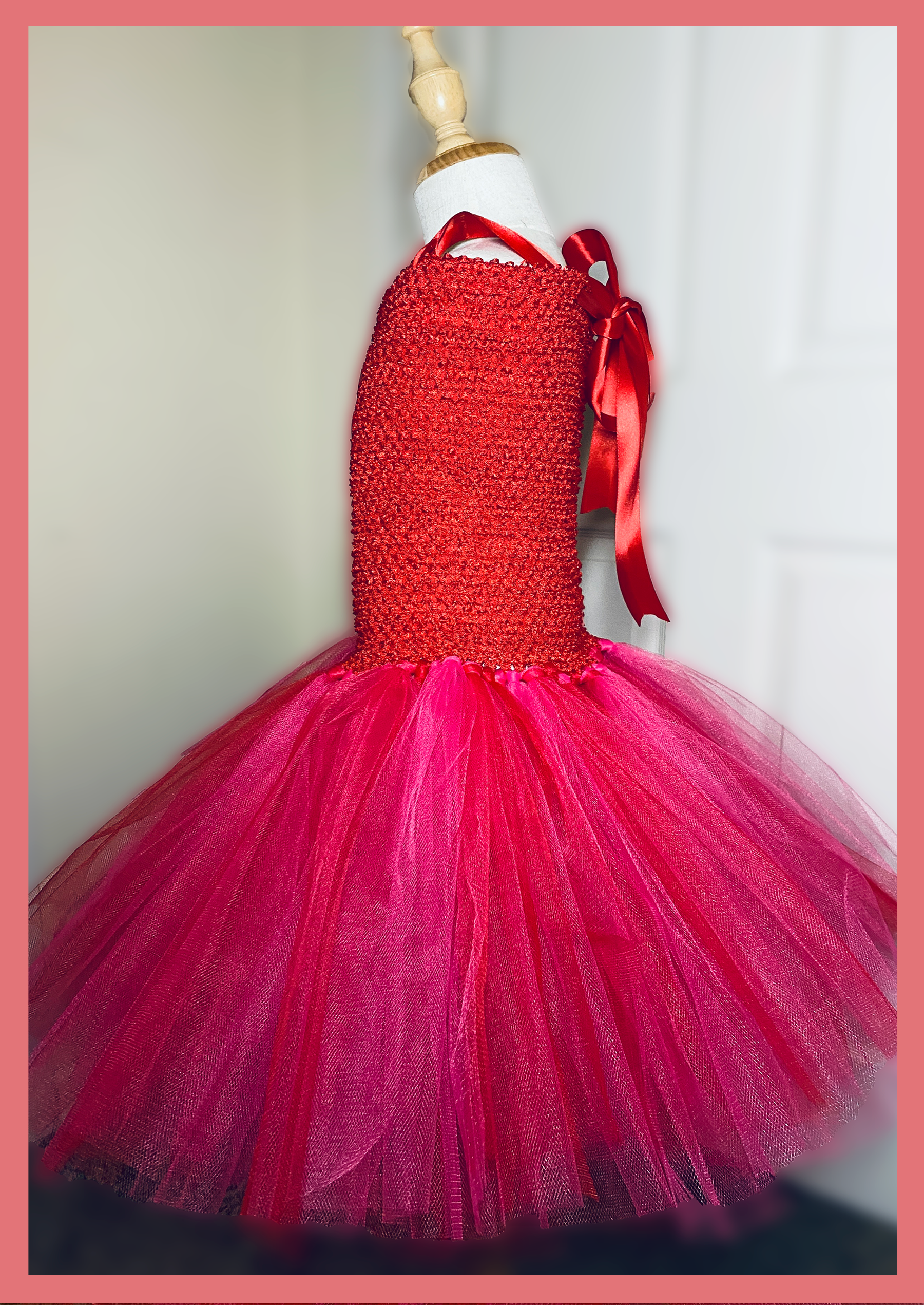 A bright and fun tutu made with fluffy tulle fabric. This amazing tutu party dress is a bright pink and red tulle for the skirt and red for the cotton lined stretchy top.