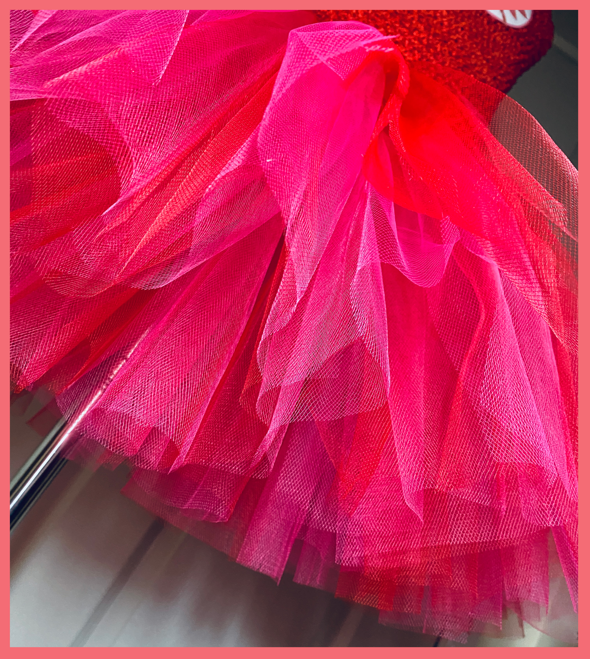 - Red and hot pink tulle skirt is crocheted into the bottom of the tube top providing a petticoat type puffiness